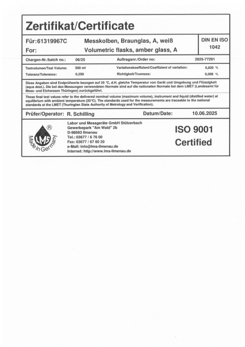 갈색 메스플라스크 500ml certi 0625